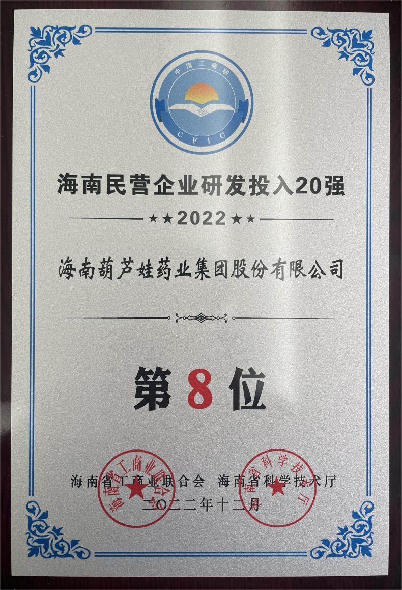 12月23日,2022海南民营企业50强和研发投入20强发布会在海口举行。会上发布了“2022海南民营企业50强”“2022海南民营企业研发投入20强”榜单和分析报告。和记官网药业再次荣登两榜,在海南民营企业50强榜单中位列第25位,较去年上升8位,这也是公司连续三年登榜;在海南民营企业研发投入20强中位列第8位,较去年上升7位。